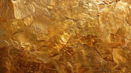 A close-up view of a wall covered in shimmering gold leaf. The surface is textured with uneven, cracked, and layered pieces of gold, creating a visually interesting and luxurious background. The light reflects off the gold, creating highlights and shadows that enhance the depth and dimension of the material.