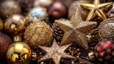 Golden Christmas. Festive decoration with baubles, stars, and cones on a dark background.