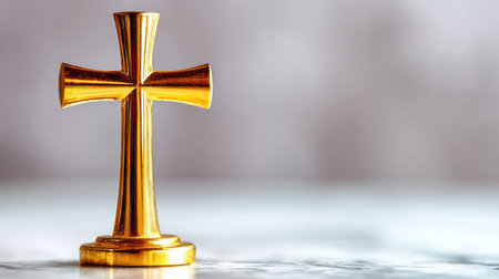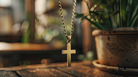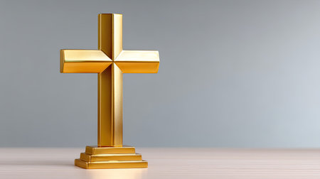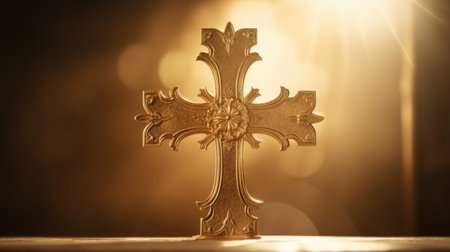 A striking golden cross rests on a wooden surface, radiating elegance and simplicity, embodying themes of faith and spirituality in a tranquil environment.