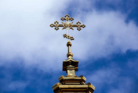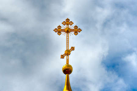 Golden Orthodox cross on a blue sky background. The cross on the dome of the temple. An Orthodox symbol.