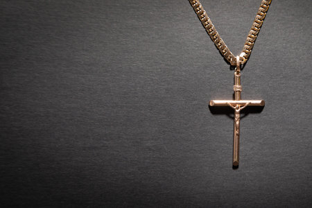 Golden cross necklace on the black background.