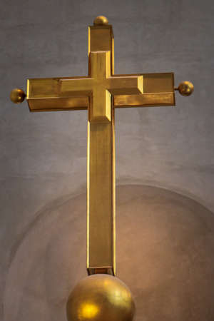 Golden crucifix mounted on the church wall. Symbol of Christianity.