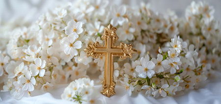 A gold cross is placed on top of a bed of white flowers. Concept of serenity and peace, as the cross and flowers are both symbols of hope and faith