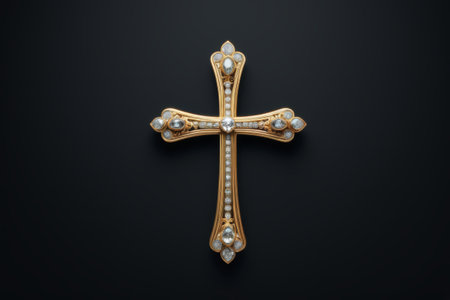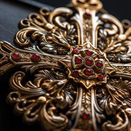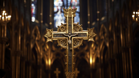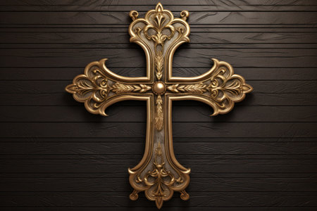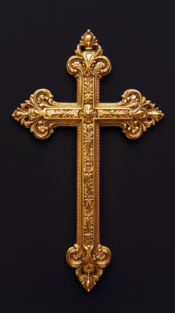 Ornate gold cross with intricate details, religious symbolism concept