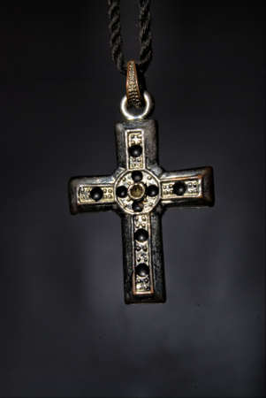 Bronze cross with red gems on a black background close-up