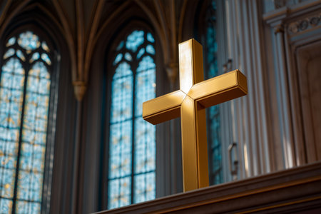 Golden cross on altar with stained glass windows in church
