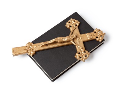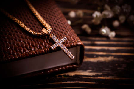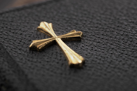 Gold color cross on the cover of an old pocket-sized bible.