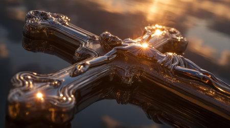 Detailed image of a Crucifix at Sunrise, with the suns rays reflecting off the polished silver of the cross, creating a dazzling display of light and shadow
