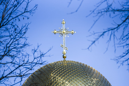 the gilded orthodox cross located on a dome of orthodox church. Belarus