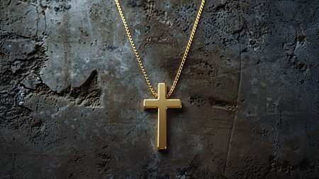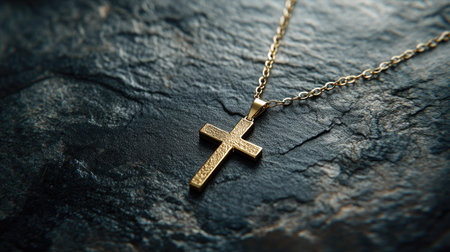 A stunning gold cross necklace resting on a dark textured stone surface, showcasing exquisite craftsmanship and elegant design in a close-up view.