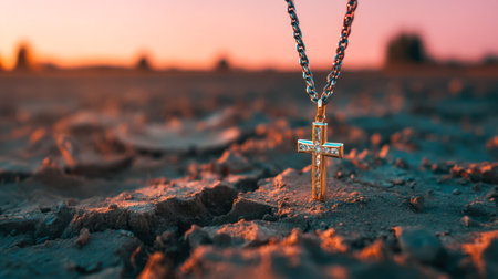A shining gold cross hangs delicately over a textured surface bathed in warm sunset hues, evoking spirituality and serene elegance.
