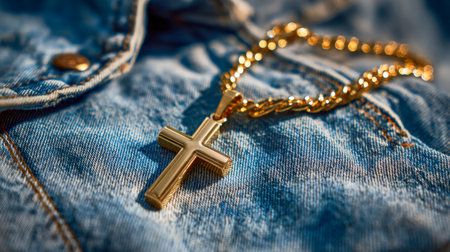 A radiant gold cross pendant adorns a rich, textured denim backdrop, illuminated by gentle sunlight that enhances its gleam and reveals delicate chain craftsmanship.