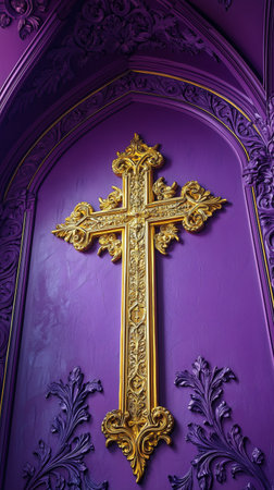 Ornate golden cross adorns a vibrant purple wall inside a historic church, showing intricate detailing and a unique color contrast that captures attention and reverence.