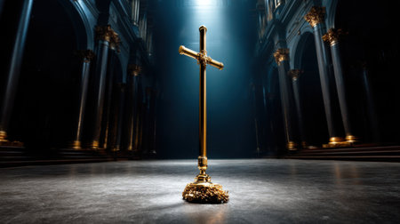 A golden cross is standing in a dark room. The room is lit by a light shining on the cross. Scene is solemn and peaceful