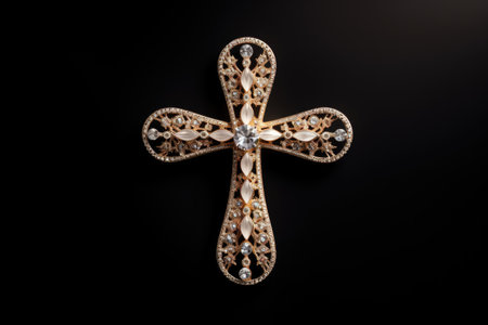 Beautiful golden cross with rhinestones symbolizing prayer faith in God isolated on a black backgrou