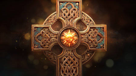 This image presents a detailed Celtic cross, featuring elaborate interwoven patterns and a central circular emblem. The color palette includes gold, brown, and hints of blue, with a textured appearance. The composition suggests a formal or decorative purpose, possibly suitable for designs or historical-themed projects. The lighting is focused.
