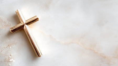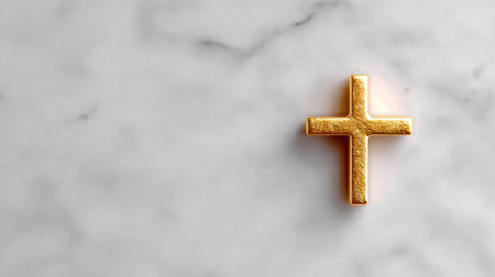 A small, elegant golden cross rests on a clean, white marble surface, creating a minimalist and luxurious composition that symbolizes faith, purity, and reverence. This image is ideal for high-end religious branding, Easter greeting cards, funeral programs, and spiritual luxury publications.