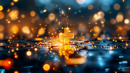 A radiant golden cross is surrounded by shimmering lights, casting a warm glow on a reflective surface. The tranquil atmosphere evokes a sense of peace and spirituality.
