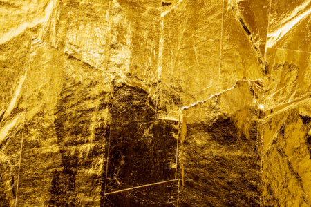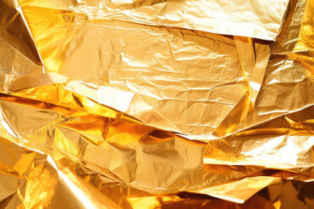 Shimmering golden foil background with intricate textures and folds creating a vibrant visual display