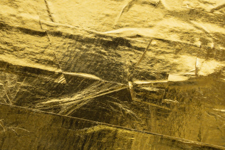 Shiny gold background made of rough textured gold foil with scratches and cracks