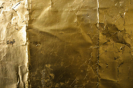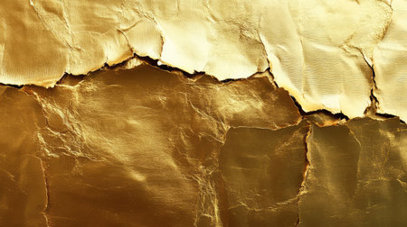 Golden and bronze foil texture with a glossy, metallic finish, creating a sleek, modern backdrop. Crinkled, grungy surface with shimmering effects, perfect for wealth or luxury decor.