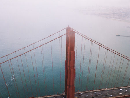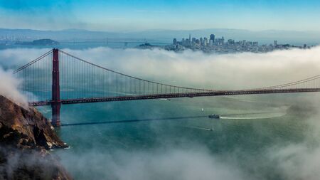 Aerial view of the Golden Gate bridge in San Francisco covered in clouds. Magical and spooky weather over California.