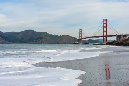 Seeing of famous Golden Gate - suspension bridge connecting San Francisco Bay and the Pacific Ocean from seashore.