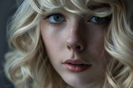 A young woman with long, wavy blonde hair gazes thoughtfully to the side. Her skin is smooth and features a natural makeup look. Soft lighting enhances her delicate features.