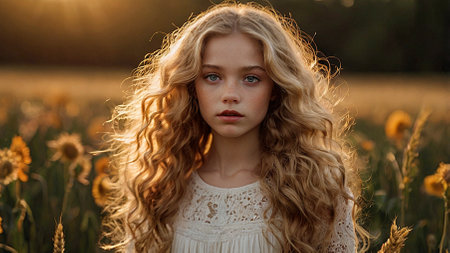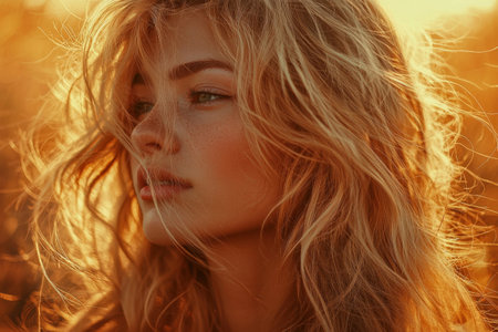 A captivating portrait of a young woman featuring golden hair illuminated by warm light, evoking beauty and serenity. The image expresses elegance and charm in a tranquil setting.