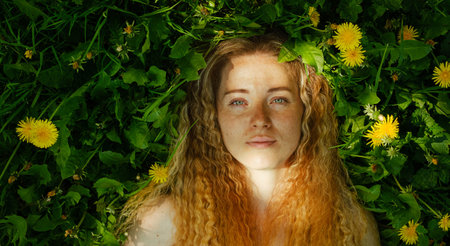 face of a beautiful red-haired woman with freckles on green grass with yellow blooming dandelions