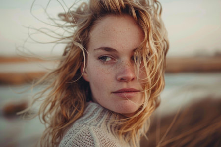 A close-up portrait of a woman with the wind gently blowing her hair while standing outdoors, highlighting natural beauty and freedom. The image evokes a sense of serenity and contemplation.