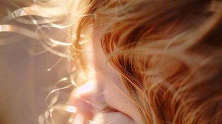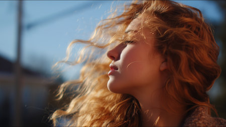Capturing a stunning close-up of a woman with curly hair illuminated by warm sunlight, this image evokes a sense of tranquility and natural beauty in a serene outdoor environment.