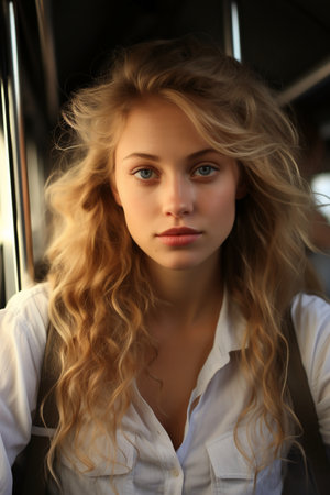 Portrait of beautiful young woman with blond curly hair in the bus.