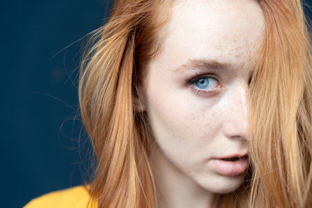 Close up portrait of a red haired girl with freckles