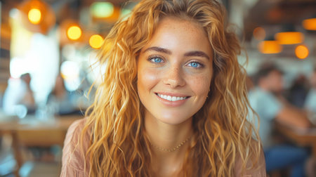 Closeup portrait of a woman with curly blonde hair and captivating blue eyes