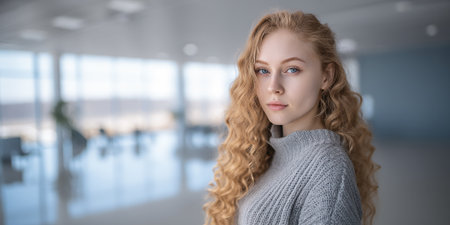 A young woman with long, curly blonde hair and blue eyes, wearing a grey turtleneck sweater, looks directly at the camera. The background is blurred, suggesting an indoor setting with large windows and natural light.