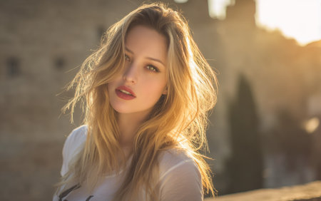 A young woman with blonde hair and green eyes is captured in a close-up portrait, bathed in the warm glow of golden hour sunlight. Her hair is windswept, framing her face as she looks directly at the camera with a soft expression. The background is blurred, suggesting an outdoor setting with architectural elements, possibly a historic town or city.