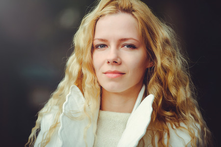 Beautiful young blond girl posing on street, closeup