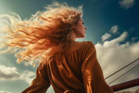 Woman with flowing hair against a blue sky by the ocean in warm sunlight