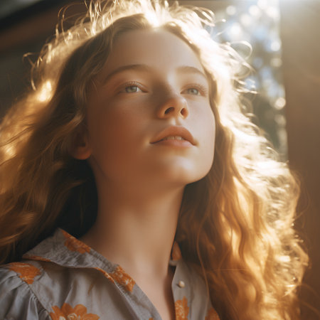 A teenage girl enjoying soft sunlight with flowing hair, radiating happiness and warmth in serene outdoor setting, creating peaceful and joyful atmosphere