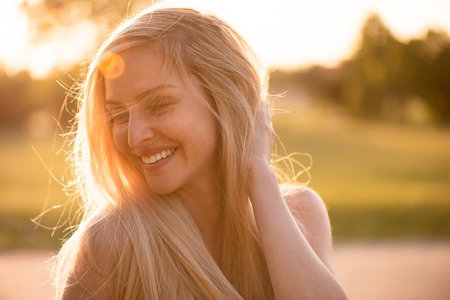 Profile of a young woman with her blonde hair illuminated by the warm sunset light