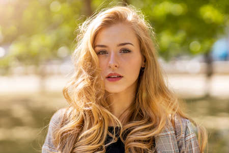 blond, long hair of pretty girl or young woman, teenager, with cute young face, healthy skin and stylish on sunny day outdoors on natural background. Beauty and skincare, copy space