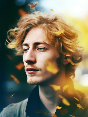 Portrait of a handsome young man with autumn leaves in his hair