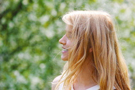 Close up portrait of a woman with her hair blowing in the wind looking off to the side in natural setting