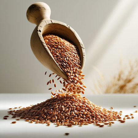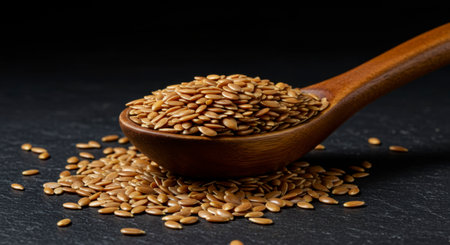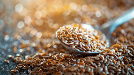 Close-Up of Flax Seeds on a Spoon Glowing in Golden Lighting, Concept of Healthy Eating, Nutrition, Organic Superfoods, Plant-Based Diet.
