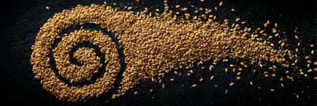 A creative design formed using roasted sesame seeds arranged in a spiral on a dark background, highlighting their golden hue and distinct shape.