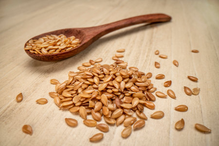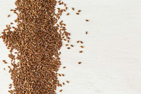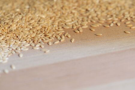 Closeup of flax seeds scattered on a wooden surface. Healthy food background