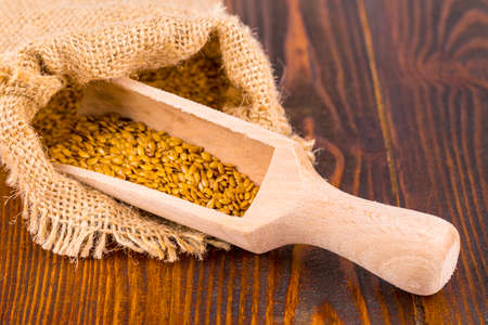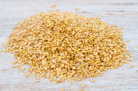 The Gold flax seeds on wooden background.