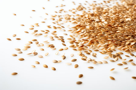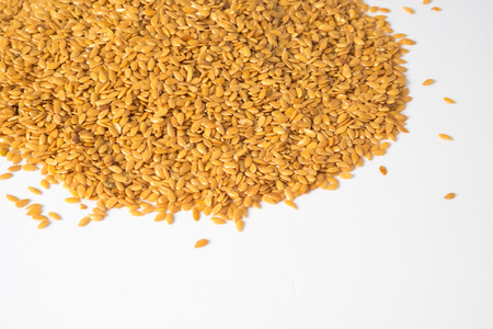 Seeds of golden flax on a white background.