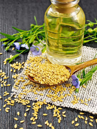 White linen seeds in a spoon, flax stalks with blue flowers and green leaves on burlap, oil in a bottle on dark wooden board background